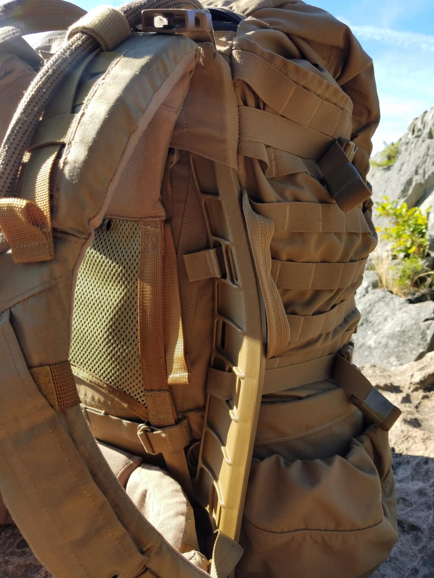 As stated before, most people tend to judge on external frames “looking uncomfortable” because they don’t feature massive amounts of spacer mesh and padding. But that’s not how an external frame works. When propably adjusted it will move the whole pack and frame away from your body, enabling Airflow. After long ruck marches you will experience less back and shoulder pain but more fatigue in the legs, which is a sign that the pack is properly adjusted. Remember, padding is mostly a solution to reduce a problem, not to fix it. Fabric doesn’t create Airflow, distance does.