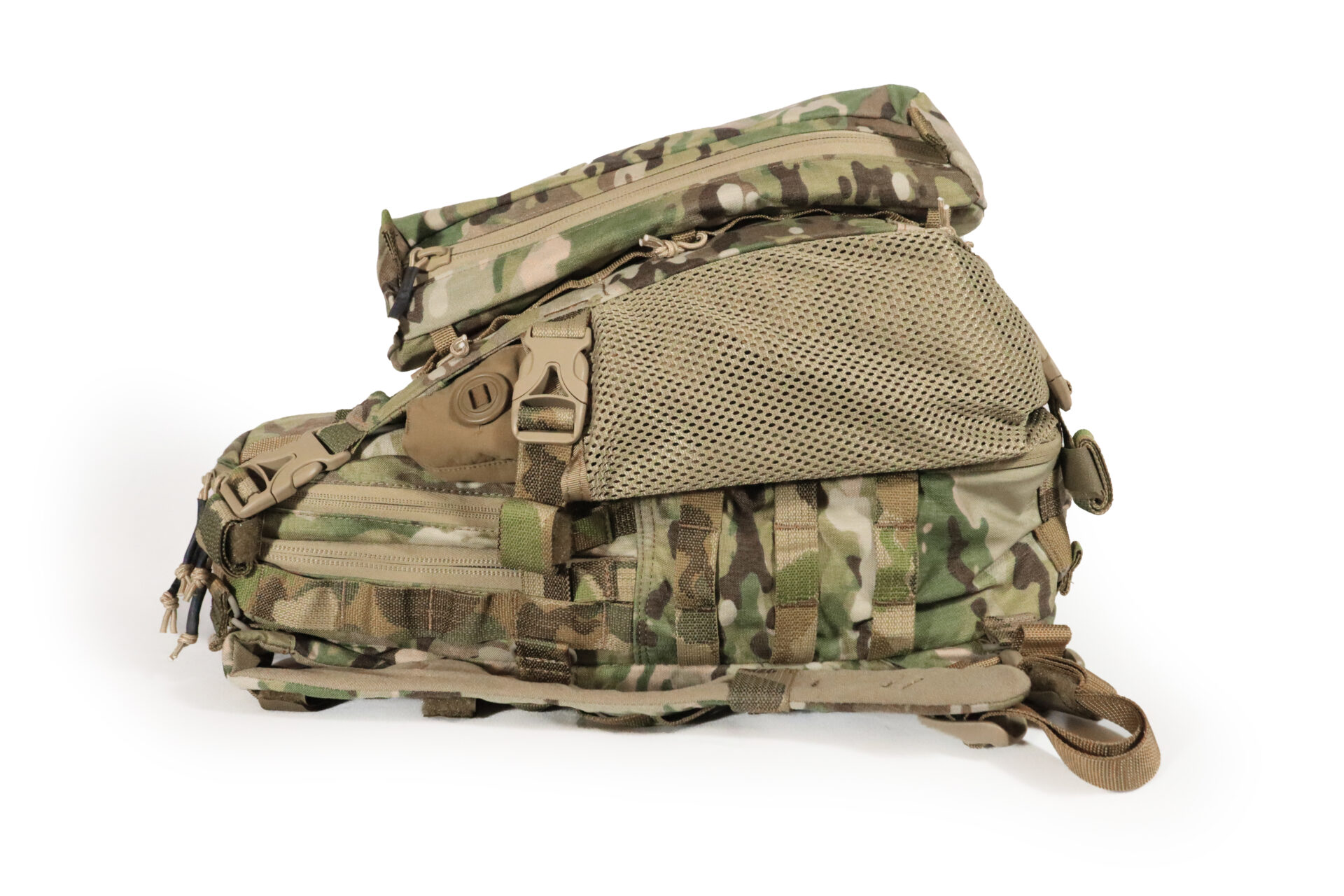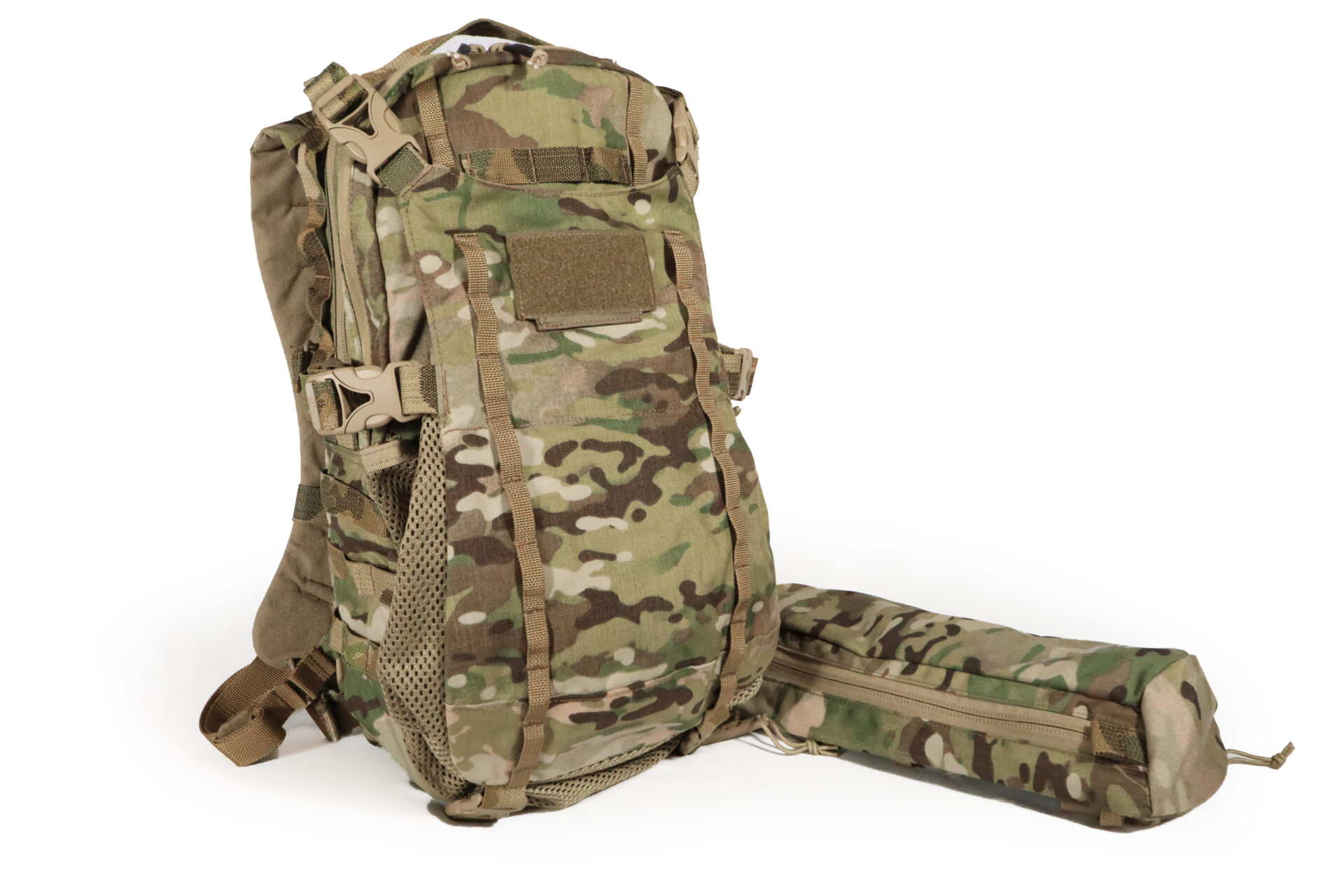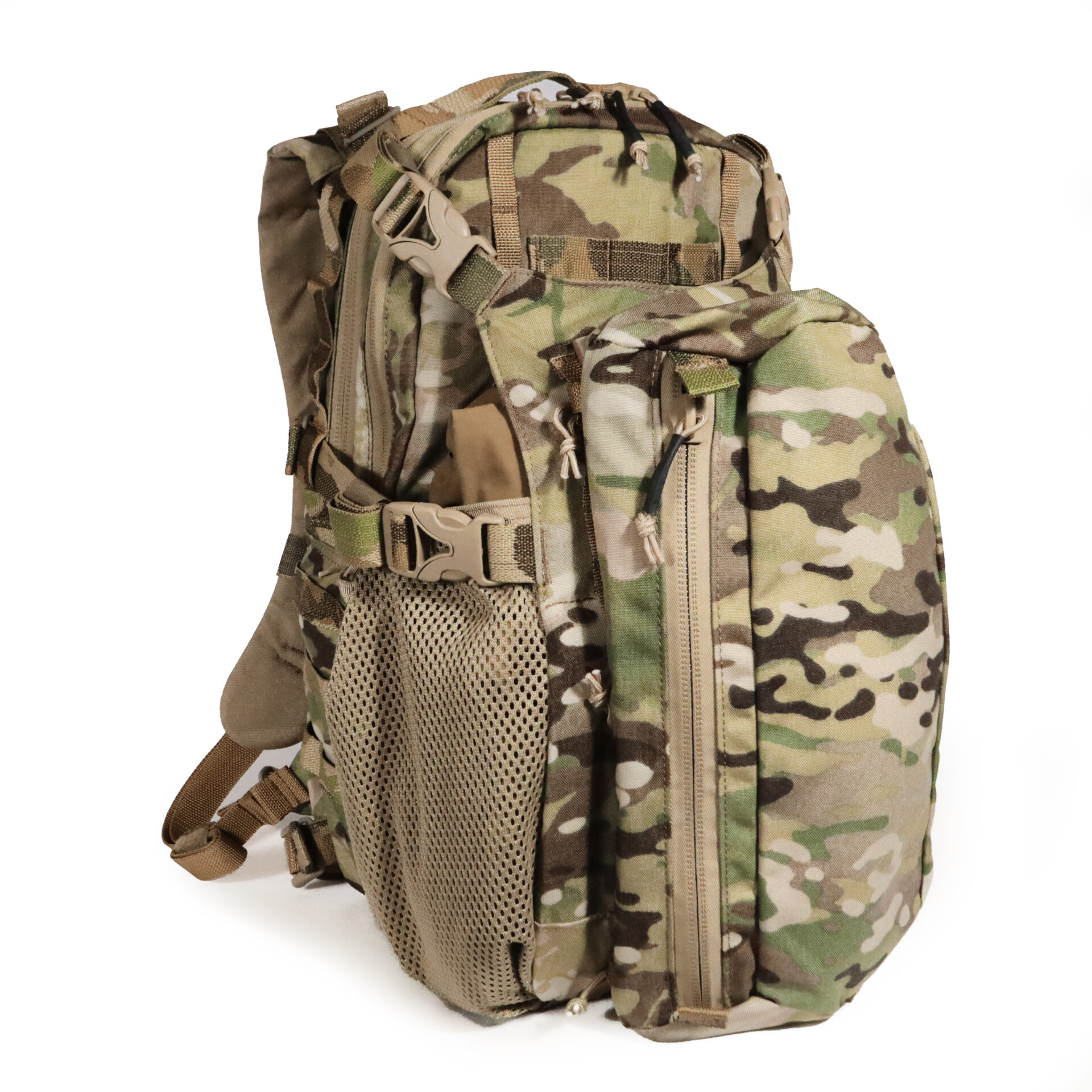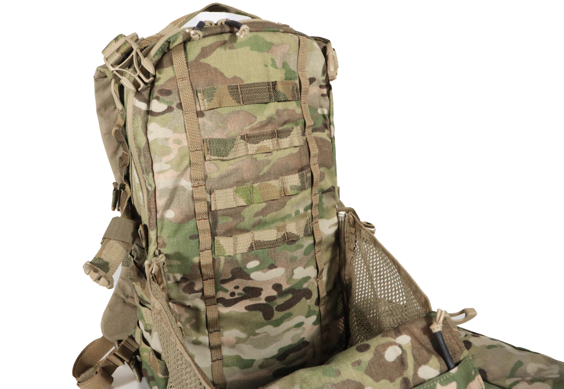 LADDER TOGGLE ATACHMENT SYSTEM™: LTAS™ is our unique way of attaching our assortment of pouches to the exterior of our packs and equipment.  LTAS™ is incredibly strong yet lightning fast. We opted for developing a new system we call LTAS™ due to the drawbacks when it comes to MOLLE for large sustainment sized pouches and equipment. As MOLLE is excellent for many applications we felt it became too heavy when it comes to a full-size pack clad from head to toe in MOLLE. In addition to the weight drawbacks, it is too slow for large pouches. LTAS™ gives you the ability in seconds to add or remove pouches giving you true modularity instead of a “semi-permanent” solution. Imagine having a suite of different sized preloaded pouches under your cot, or inside a cage ready to go in a movements notice. No need to unpack or repack anymore, just grab the pouch you need, preloaded and toggle it on in seconds.